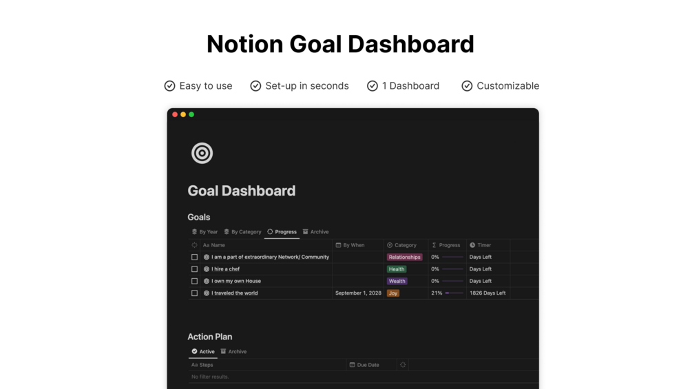 Stay on Target, See Results: Utilize the Notion Goal Dashboard to enhance goal pursuit. Maintain focus, sustain momentum, and witness dreams become reality.